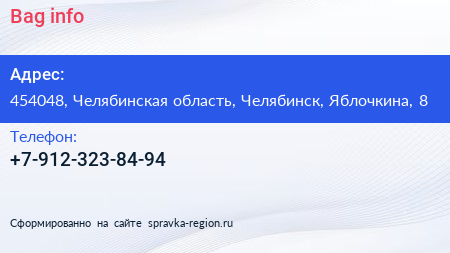 Bag-info по адресу 454048, Челябинская область, Челябинск, Яблочкина, 8 в дальнейшем Организация, размещена в следующих категориях: