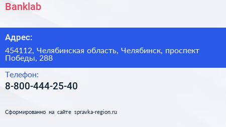 Banklab по адресу 454112, Челябинская область, Челябинск, проспект Победы, 288 в дальнейшем Организация, размещена в следующих категориях:
