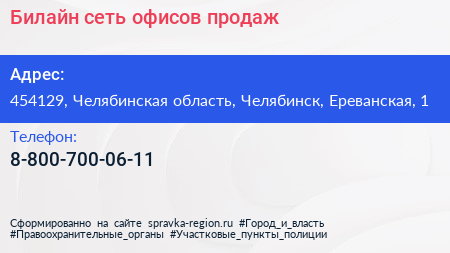 Билайн, сеть офисов продаж по адресу 454129, Челябинская область, Челябинск, Ереванская, 1 в дальнейшем Организация, размещена в следующих категориях: