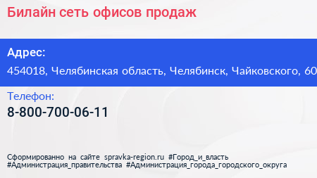 Билайн, сеть офисов продаж по адресу 454018, Челябинская область, Челябинск, Чайковского, 60 в дальнейшем Организация, размещена в следующих категориях: