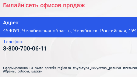 Билайн, сеть офисов продаж по адресу 454091, Челябинская область, Челябинск, Российская, 194 в дальнейшем Организация, размещена в следующих категориях: