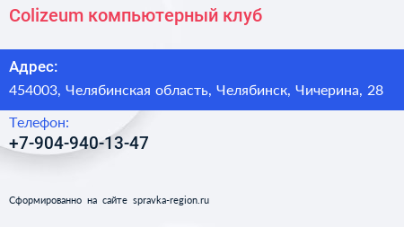 Colizeum, компьютерный клуб по адресу 454003, Челябинская область, Челябинск, Чичерина, 28 в дальнейшем Организация, размещена в следующих категориях: