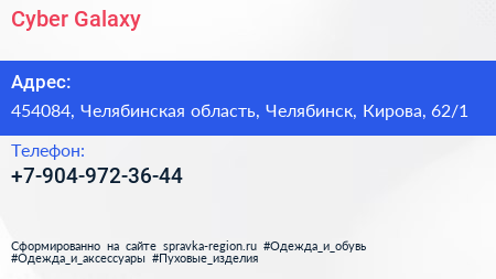 Cyber Galaxy по адресу 454084, Челябинская область, Челябинск, Кирова, 62/1 в дальнейшем Организация, размещена в следующих категориях:
