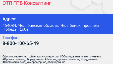 ЭТП ГПБ Консалтинг по адресу 454084, Челябинская область, Челябинск, проспект Победы, 160в в дальнейшем Организация, размещена в следующих категориях: