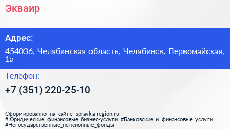 Экваир по адресу 454036, Челябинская область, Челябинск, Первомайская, 1а в дальнейшем Организация, размещена в следующих категориях: