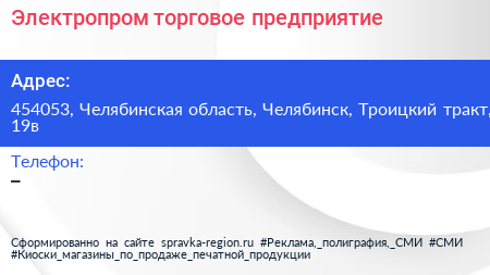 Электропром, торговое предприятие по адресу 454053, Челябинская область, Челябинск, Троицкий тракт, 19в в дальнейшем Организация, размещена в следующих категориях: