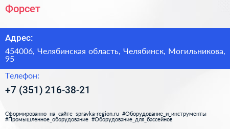 Форсет по адресу 454006, Челябинская область, Челябинск, Могильникова, 95 в дальнейшем Организация, размещена в следующих категориях: