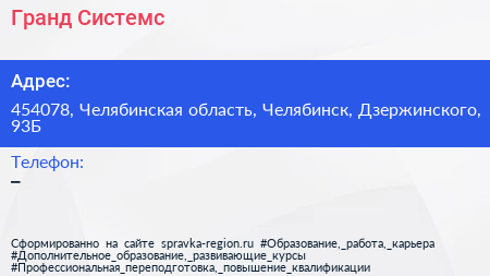 Гранд-Системс по адресу 454078, Челябинская область, Челябинск, Дзержинского, 93Б в дальнейшем Организация, размещена в следующих категориях: