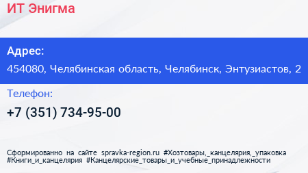 ИТ Энигма по адресу 454080, Челябинская область, Челябинск, Энтузиастов, 2 в дальнейшем Организация, размещена в следующих категориях: