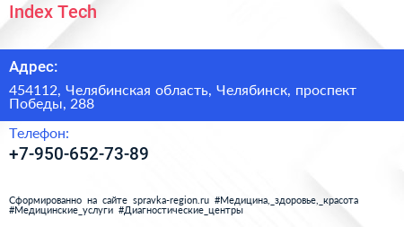 Index Tech по адресу 454112, Челябинская область, Челябинск, проспект Победы, 288 в дальнейшем Организация, размещена в следующих категориях: