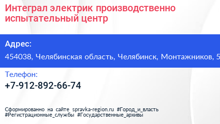 Интеграл-электрик, производственно-испытательный центр по адресу 454038, Челябинская область, Челябинск, Монтажников, 5 в дальнейшем Организация, размещена в следующих категориях: