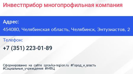 Инвестприбор, многопрофильная компания по адресу 454080, Челябинская область, Челябинск, Энтузиастов, 2 в дальнейшем Организация, размещена в следующих категориях: