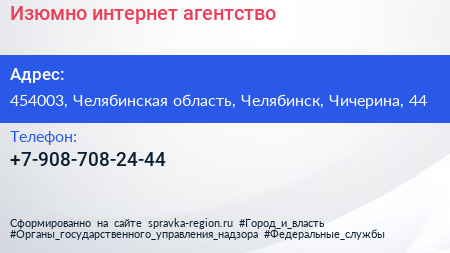 Изюмно, интернет-агентство по адресу 454003, Челябинская область, Челябинск, Чичерина, 44 в дальнейшем Организация, размещена в следующих категориях: