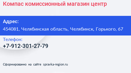 Компас, комиссионный магазин-центр по адресу 454081, Челябинская область, Челябинск, Горького, 67 в дальнейшем Организация, размещена в следующих категориях: