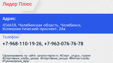 Лидер Плюс по адресу 456618, Челябинская область, Челябинск, Коммунистический проспект, 24а в дальнейшем Организация, размещена в следующих категориях: