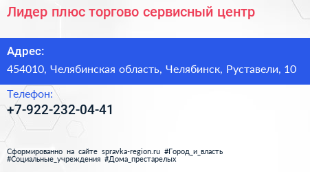Лидер-плюс, торгово-сервисный центр по адресу 454010, Челябинская область, Челябинск, Руставели, 10 в дальнейшем Организация, размещена в следующих категориях: