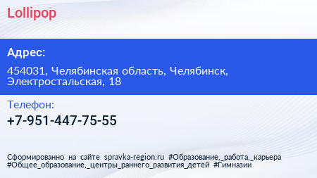Lollipop по адресу 454031, Челябинская область, Челябинск, Электростальская, 18 в дальнейшем Организация, размещена в следующих категориях: