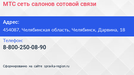 МТС, сеть салонов сотовой связи по адресу 454087, Челябинская область, Челябинск, Дарвина, 18 в дальнейшем Организация, размещена в следующих категориях: