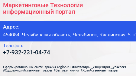 Маркетинговые Технологии, информационный портал по адресу 454084, Челябинская область, Челябинск, Каслинская, 5 к1 в дальнейшем Организация, размещена в следующих категориях: