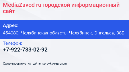 MediaZavod.ru, городской информационный сайт по адресу 454080, Челябинская область, Челябинск, Энгельса, 38Б в дальнейшем Организация, размещена в следующих категориях: