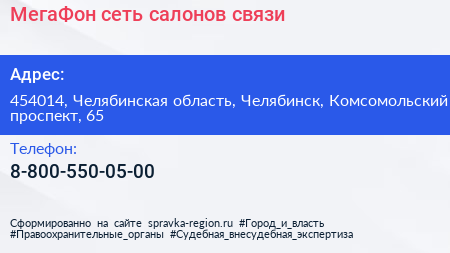 МегаФон, сеть салонов связи по адресу 454014, Челябинская область, Челябинск, Комсомольский проспект, 65 в дальнейшем Организация, размещена в следующих категориях: