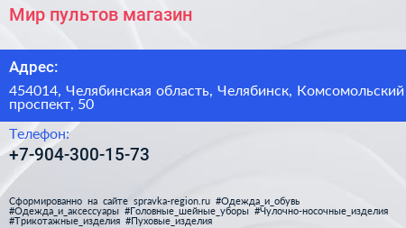 Мир пультов, магазин по адресу 454014, Челябинская область, Челябинск, Комсомольский проспект, 50 в дальнейшем Организация, размещена в следующих категориях: