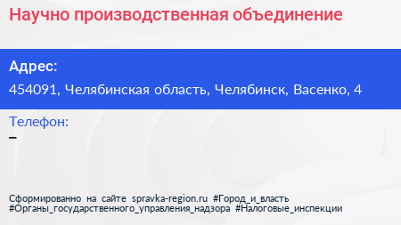 Научно-производственная объединение по адресу 454091, Челябинская область, Челябинск, Васенко, 4 в дальнейшем Организация, размещена в следующих категориях:
