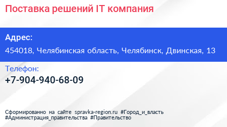 Поставка решений, IT-компания по адресу 454018, Челябинская область, Челябинск, Двинская, 13 в дальнейшем Организация, размещена в следующих категориях: