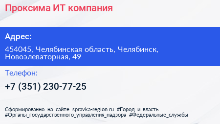 Проксима-ИТ, компания по адресу 454045, Челябинская область, Челябинск, Новоэлеваторная, 49 в дальнейшем Организация, размещена в следующих категориях: