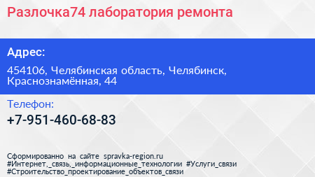 Разлочка74, лаборатория ремонта по адресу 454106, Челябинская область, Челябинск, Краснознамённая, 44 в дальнейшем Организация, размещена в следующих категориях: