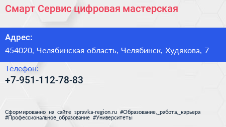 Смарт Сервис, цифровая мастерская по адресу 454020, Челябинская область, Челябинск, Худякова, 7 в дальнейшем Организация, размещена в следующих категориях: