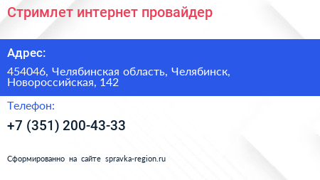 Стримлет, интернет-провайдер по адресу 454046, Челябинская область, Челябинск, Новороссийская, 142 в дальнейшем Организация, размещена в следующих категориях: