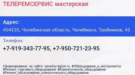 ТЕЛЕРЕМСЕРВИС, мастерская по адресу 454135, Челябинская область, Челябинск, Трубников, 41 в дальнейшем Организация, размещена в следующих категориях: