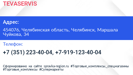 TEVASERVIS по адресу 454076, Челябинская область, Челябинск, Маршала Чуйкова, 34 в дальнейшем Организация, размещена в следующих категориях: