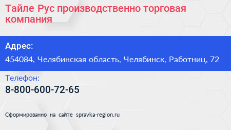 Тайле Рус, производственно-торговая компания по адресу 454084, Челябинская область, Челябинск, Работниц, 72 в дальнейшем Организация, размещена в следующих категориях: