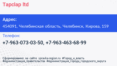 Tapclap ltd. по адресу 454091, Челябинская область, Челябинск, Кирова, 159 в дальнейшем Организация, размещена в следующих категориях: