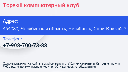 Topskill, компьютерный клуб по адресу 454080, Челябинская область, Челябинск, Сони Кривой, 24 в дальнейшем Организация, размещена в следующих категориях: