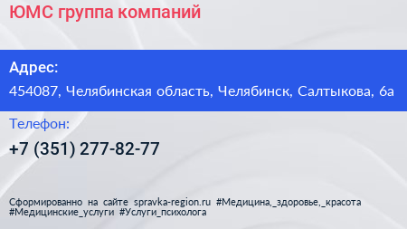ЮМС, группа компаний по адресу 454087, Челябинская область, Челябинск, Салтыкова, 6а в дальнейшем Организация, размещена в следующих категориях: