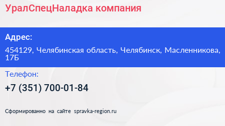 УралСпецНаладка, компания по адресу 454129, Челябинская область, Челябинск, Масленникова, 17Б в дальнейшем Организация, размещена в следующих категориях:
