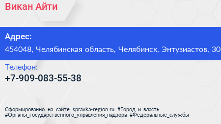 Викан Айти по адресу 454048, Челябинская область, Челябинск, Энтузиастов, 30 в дальнейшем Организация, размещена в следующих категориях: