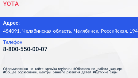 YOTA по адресу 454091, Челябинская область, Челябинск, Российская, 194 в дальнейшем Организация, размещена в следующих категориях: