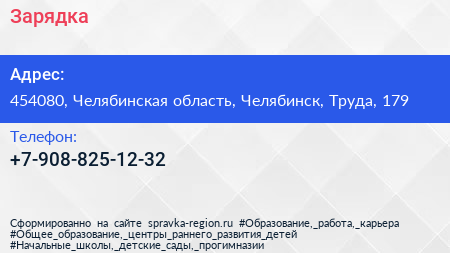 Зарядка по адресу 454080, Челябинская область, Челябинск, Труда, 179 в дальнейшем Организация, размещена в следующих категориях: