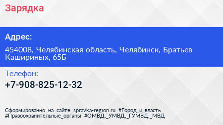 Зарядка по адресу 454008, Челябинская область, Челябинск, Братьев Кашириных, 65Б в дальнейшем Организация, размещена в следующих категориях: