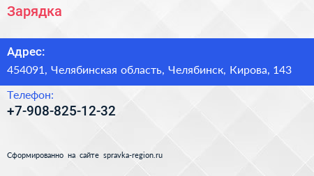 Зарядка по адресу 454091, Челябинская область, Челябинск, Кирова, 143 в дальнейшем Организация, размещена в следующих категориях: