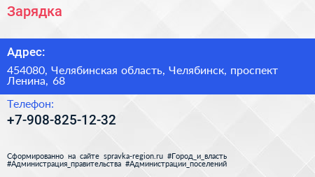 Зарядка по адресу 454080, Челябинская область, Челябинск, проспект Ленина, 68 в дальнейшем Организация, размещена в следующих категориях: