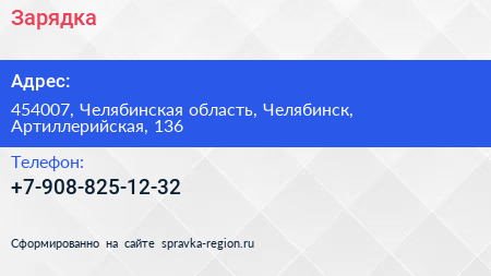Зарядка по адресу 454007, Челябинская область, Челябинск, Артиллерийская, 136 в дальнейшем Организация, размещена в следующих категориях: