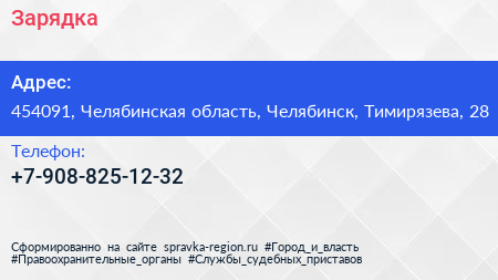 Зарядка по адресу 454091, Челябинская область, Челябинск, Тимирязева, 28 в дальнейшем Организация, размещена в следующих категориях: