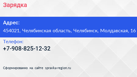 Зарядка по адресу 454021, Челябинская область, Челябинск, Молдавская, 16 в дальнейшем Организация, размещена в следующих категориях: