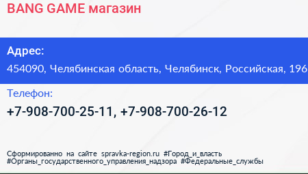 BANG GAME, магазин по адресу 454090, Челябинская область, Челябинск, Российская, 196 в дальнейшем Организация, размещена в следующих категориях: