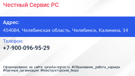 Честный Сервис PC по адресу 454084, Челябинская область, Челябинск, Калинина, 14 в дальнейшем Организация, размещена в следующих категориях: